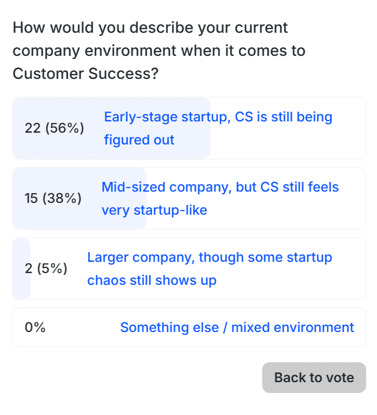 We’ll give it about a minute for you to vote, but it looks like around 70% of the audience is in early-stage startups. We’ll wait just a few more seconds, but this already shows that many of you are operating in environments where CS expectations are high, while structure and clarity are still forming. That’s exactly where we’ll begin today’s discussion.
