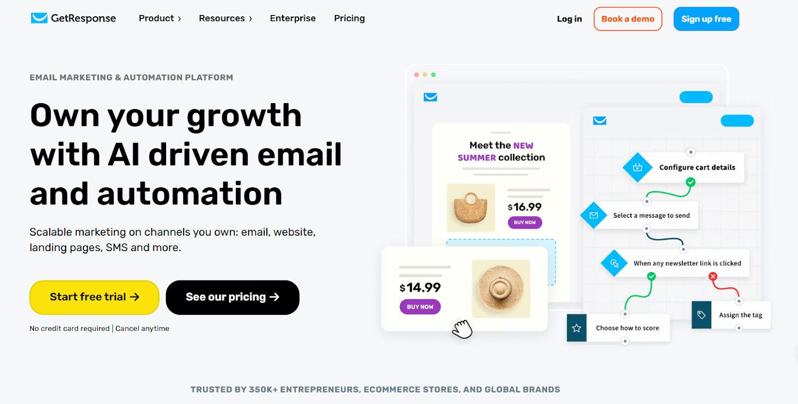 Starter – $15.58/month (includes AI email generator, unlimited autoresponders, landing pages, custom automation workflows, signup forms, and 24/7 chat support)