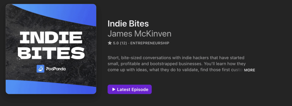 Indie Bites is a podcast that focuses on early-stage startups and founders, many of whom launched their businesses independently. Hosted by James McKinven, the podcast is concise and chock-full of expert insights. Guests are usually founders who talk about their journeys and challenges building SaaS without massive budgets and backing.