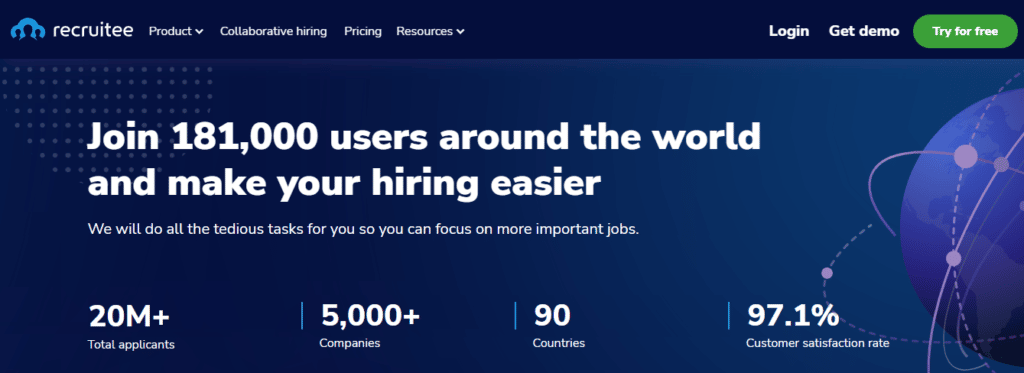 Next, Recruitee uses numbers to double down on that trust and credibility. The homepage notes that the company has over 180K users already with 5,000+ companies across 90 countries. And they all have a 97.1% customer satisfaction rate.